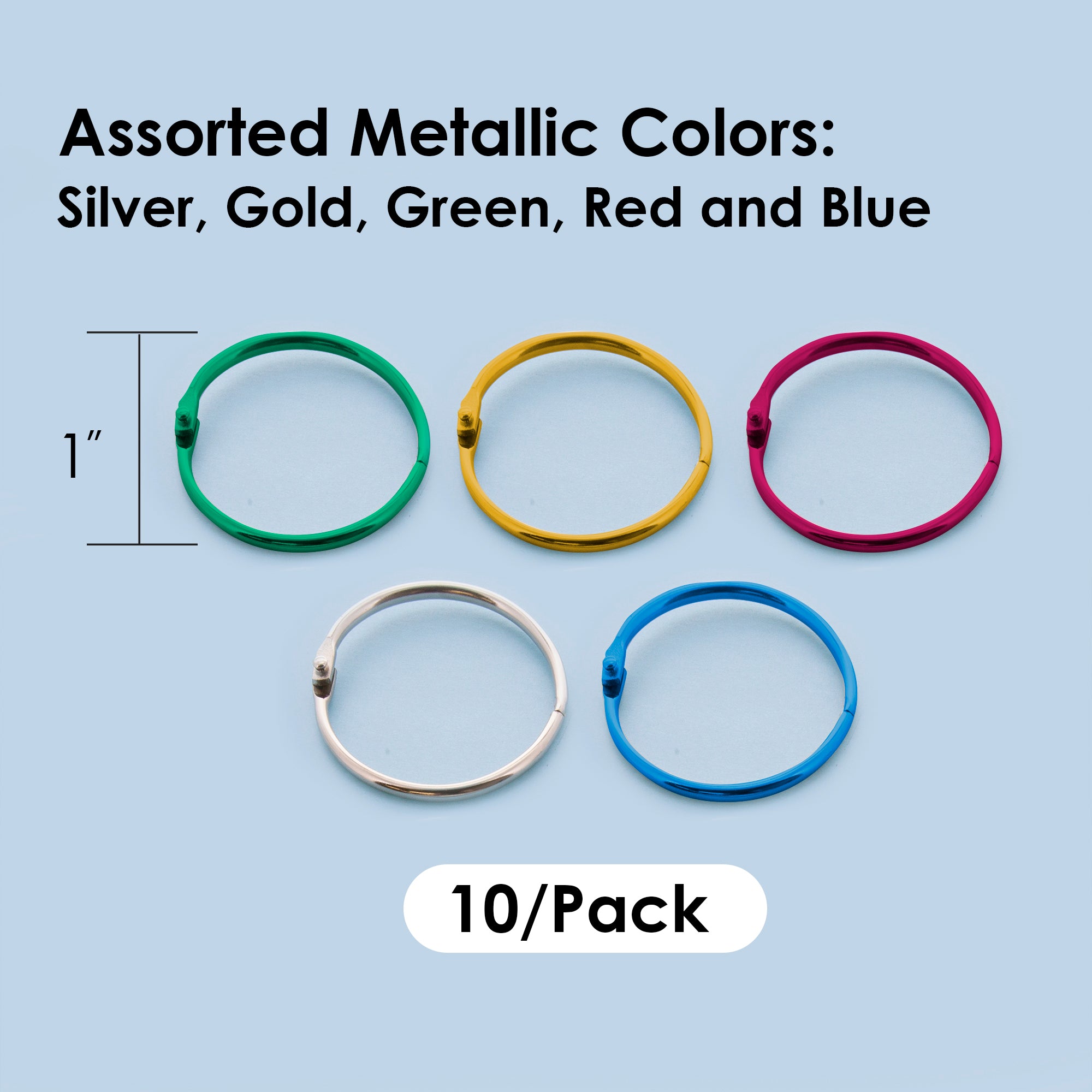 ASSORTED COLORS. Assorted Color Metal Book Rings are 1″ inch in diameter and each pack comes with 10 rings. You will receive some or all of the following metallic colors: Silver, Gold, Green, Red and Blue.