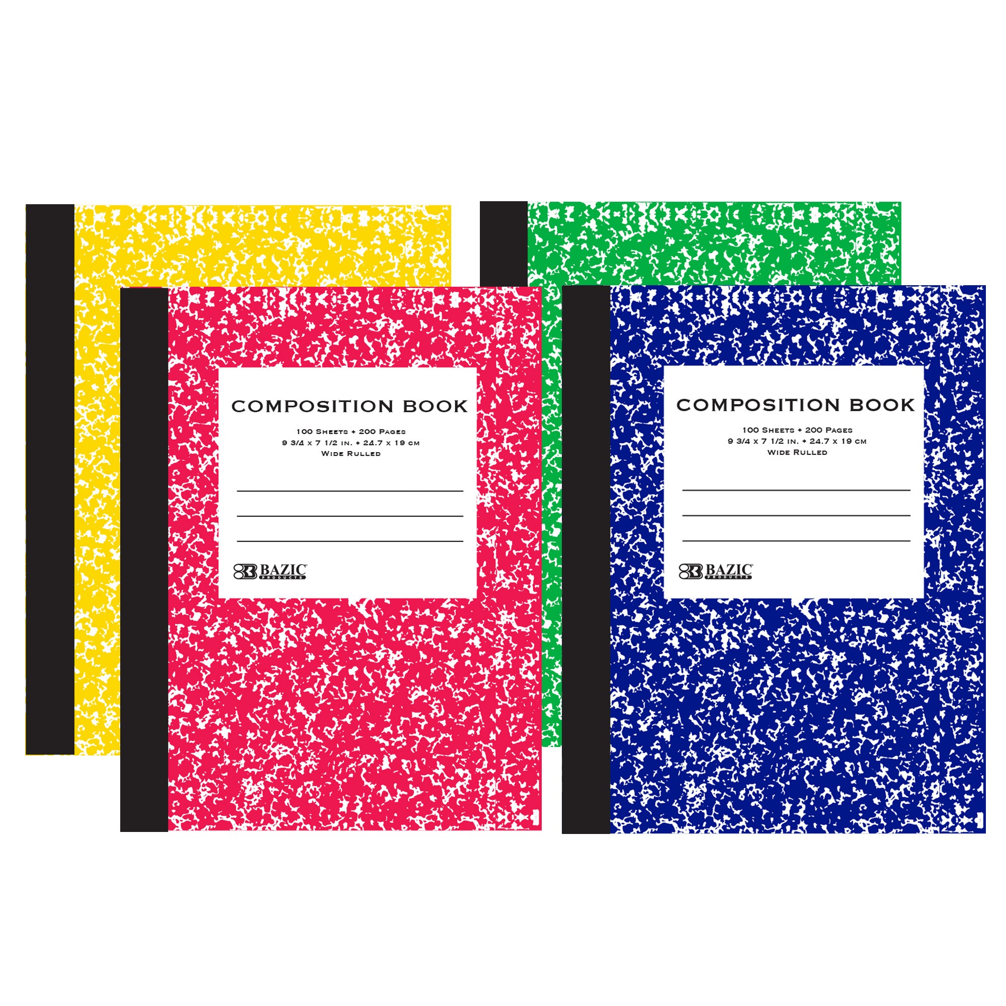 SIMPLY NOTETAKING. Assorted color marble composition notebooks come with 100 sheets of wide-ruled paper. Each set comes with 4 assorted color covered notebooks. Overall size: 9.75″ x 7.5″inches.