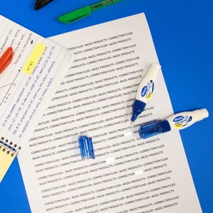 FAST-DRYING. Faster drying formula with bright white fluid that blends well with white paper and covers handwritten and printed ink-even permanent marker.
