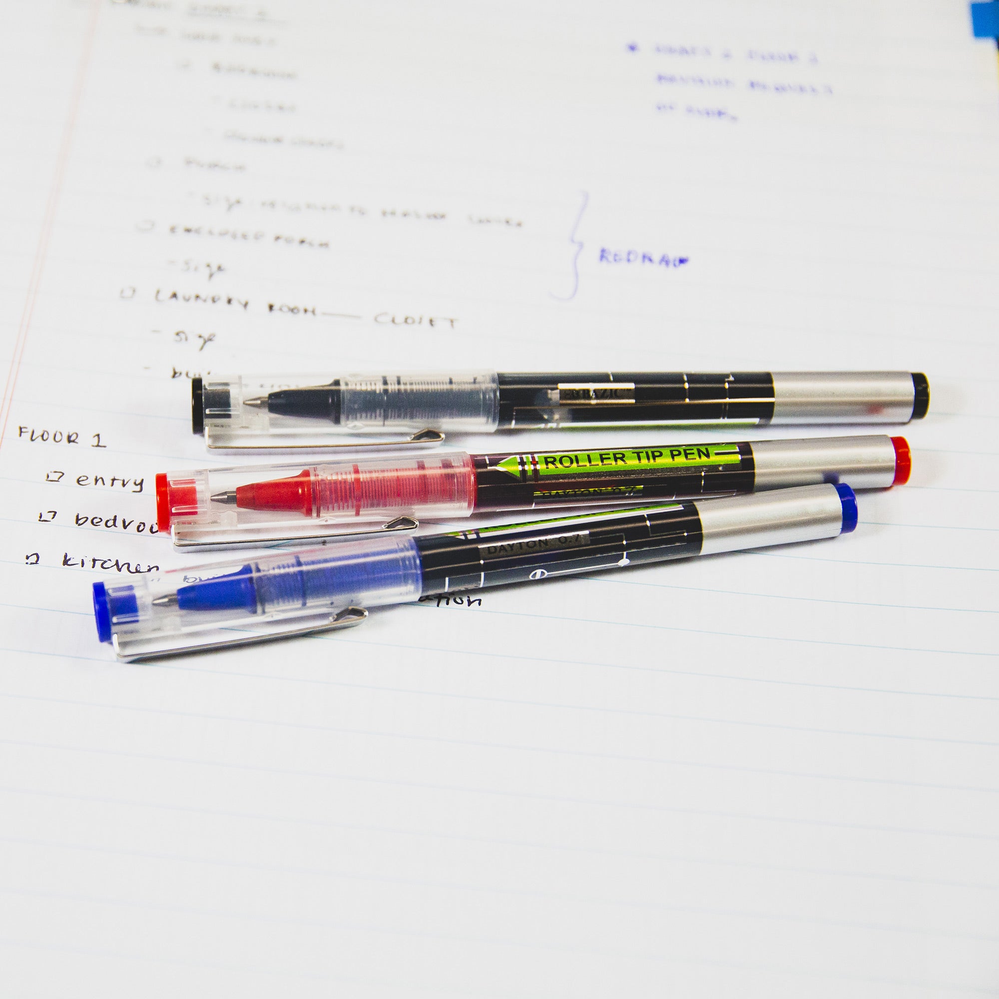 DAYTON ASSORTED COLOR ROLLERBALL PEN. Each pack includes 3-Assorted Rollerball Pens; Red, Black and Blue. These fine point pens flow free and write more smoothly than traditional pens.