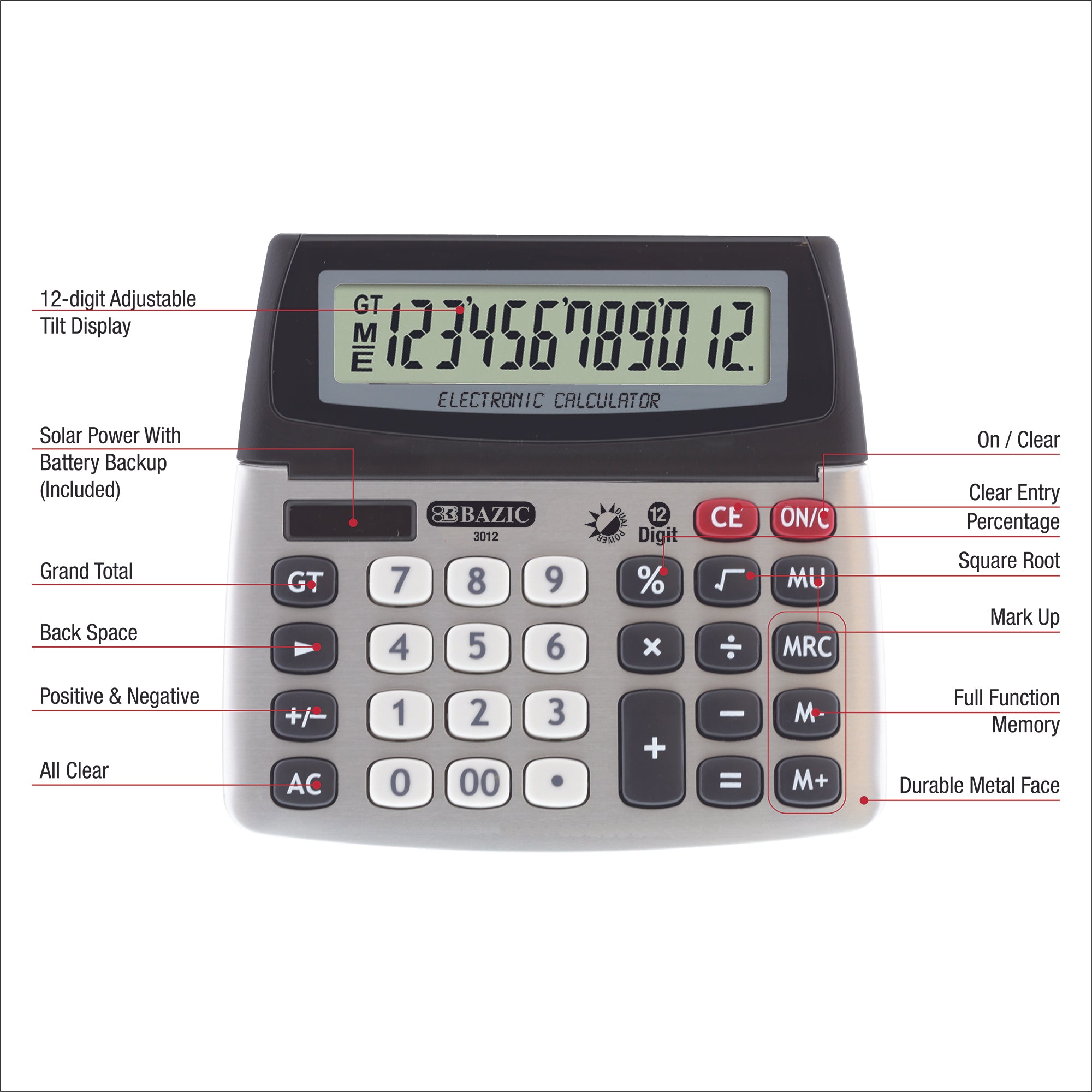 LARGE LCD DISPLAY. Adjustable Tilt Display. 12 Digits jumbo number display, easy to read, eye-angled, upright.Tax rate calculation. Auto power off. Non-skid base.