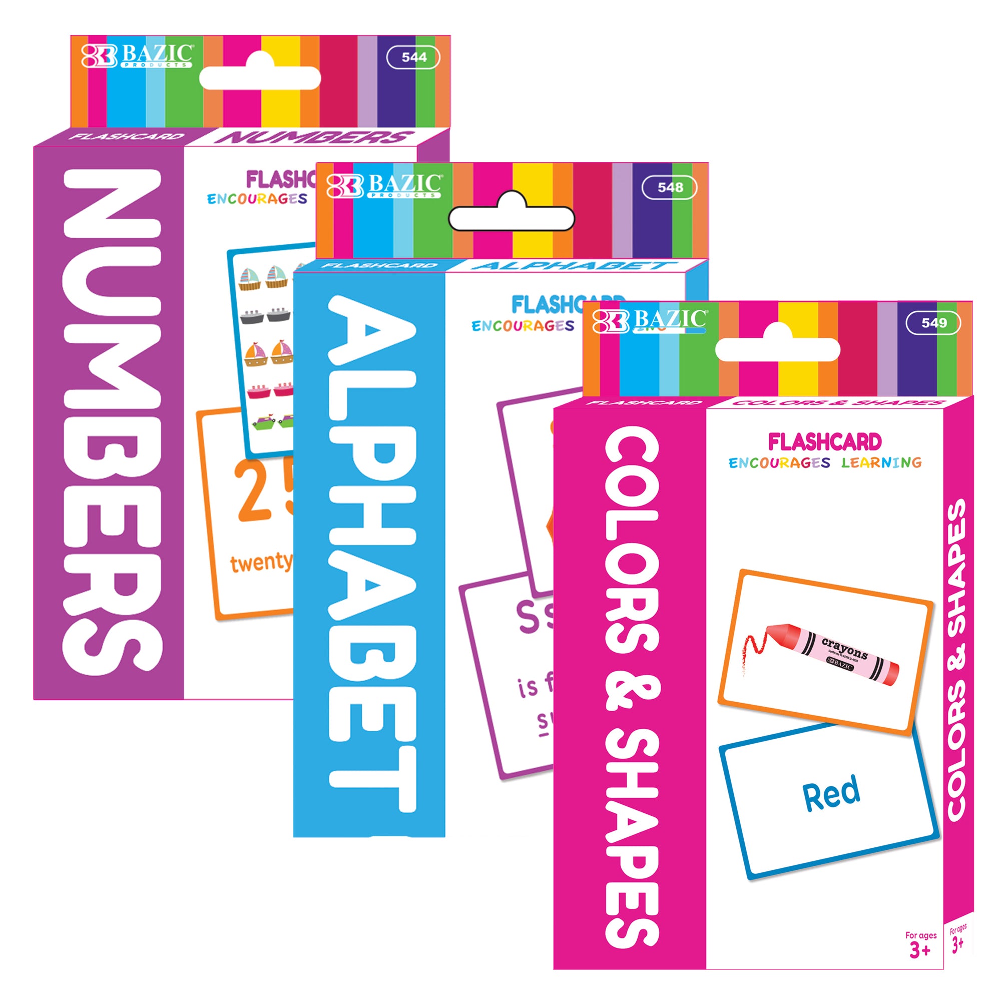 • MATH SKILL DEVELOPMENT. These 3 1/8 x 4 5/8inch flashcards will help teach your child basic math calculations. This set comes with one pack of each: Numbers, Alphabet, and Colors