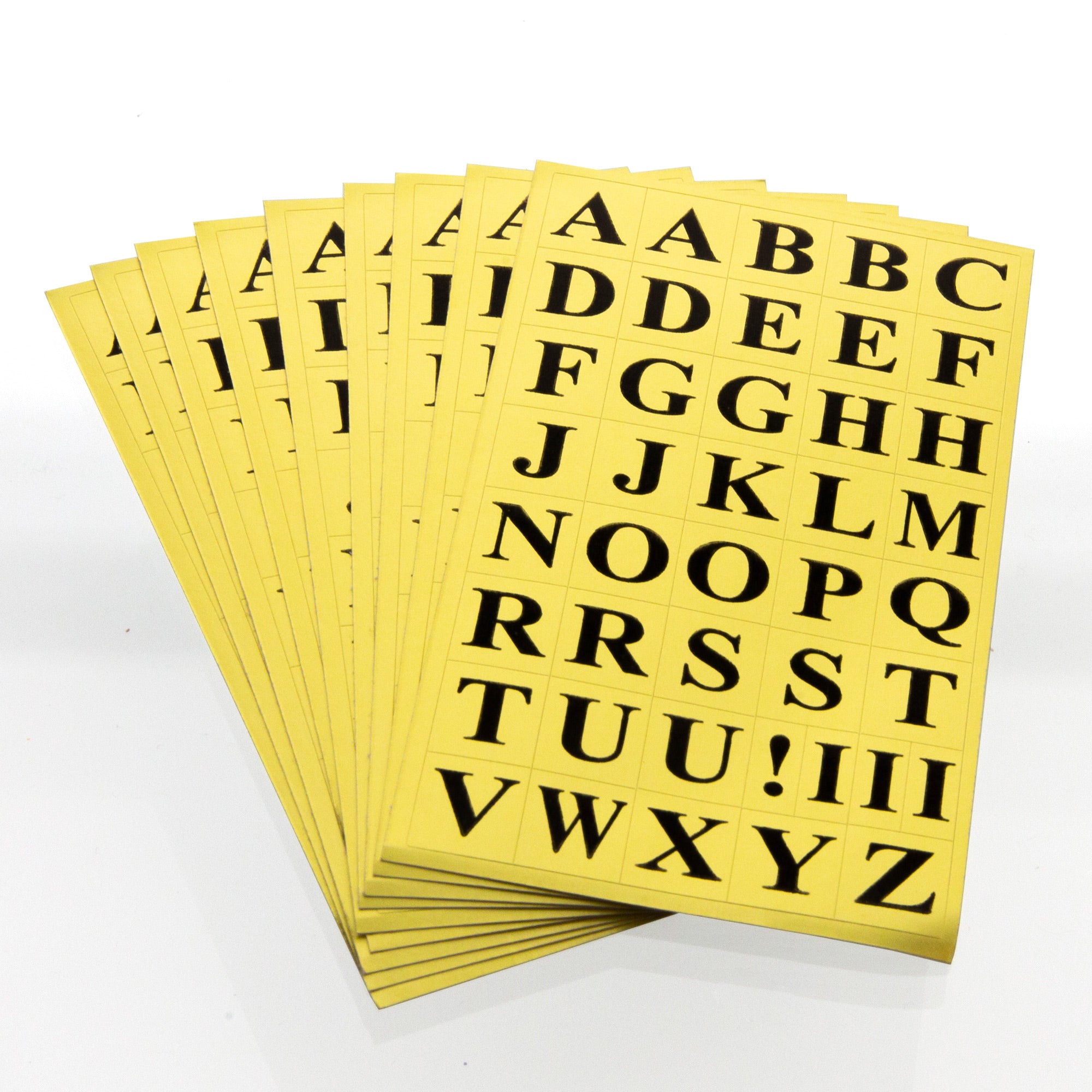 • GOLDEN STICKER. Gold foli color with black printed alphabet uppercase letter. Also feature symbol: Exclamation! Permanent Adhesive. Measure: 1/2″ x 5/8″. Total 378 labels per pack.