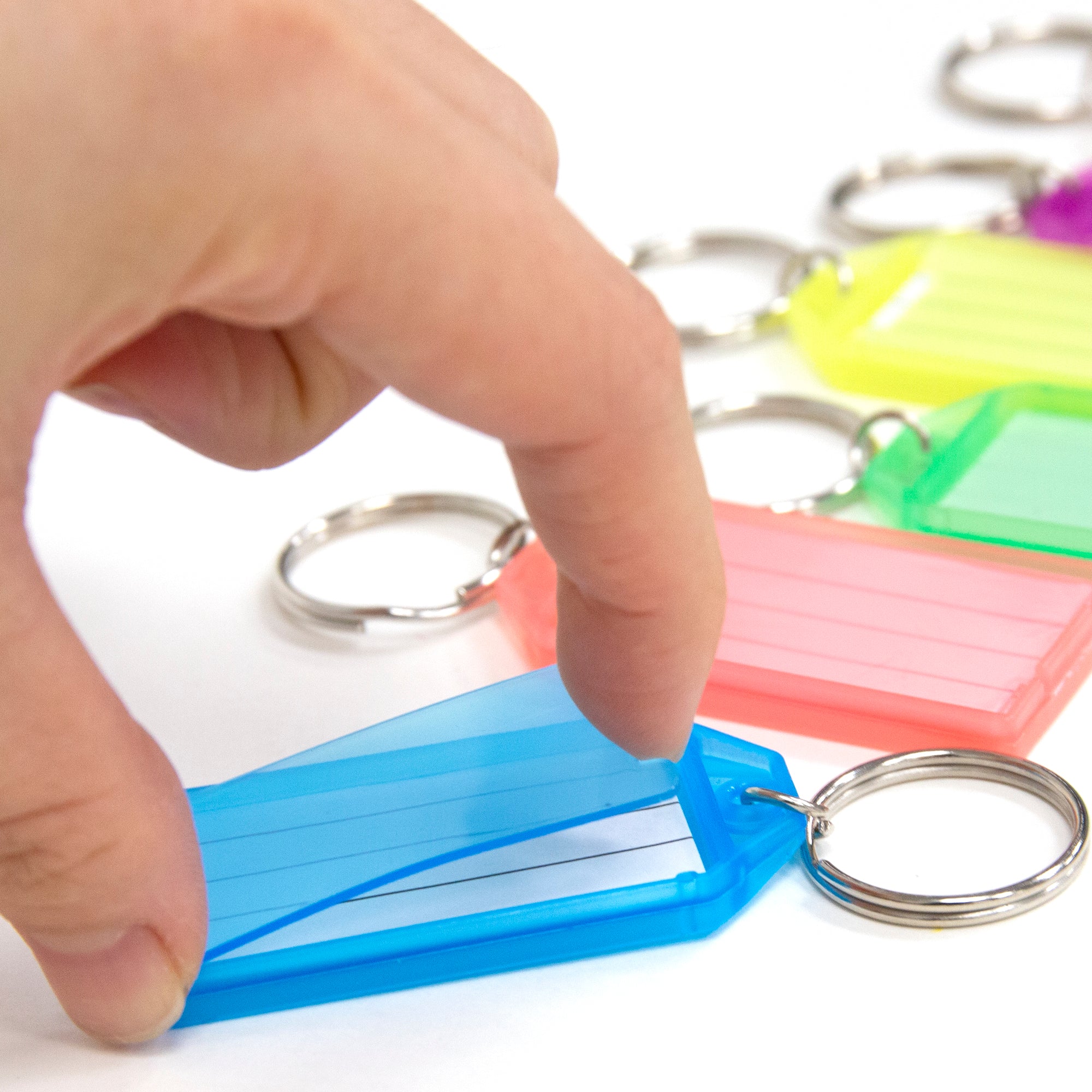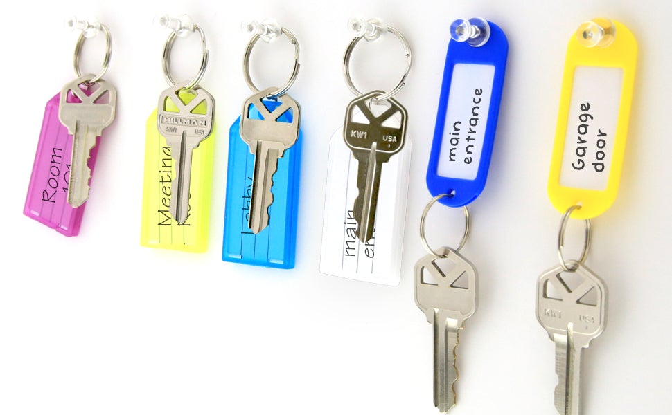 ASSORTED COLORS. Key tags come in 6 assorted colors of White, Blue, Pink, Green, Yellow and Purple. Great colors for identifying different keys for different locks. Actual Colors May Vary!