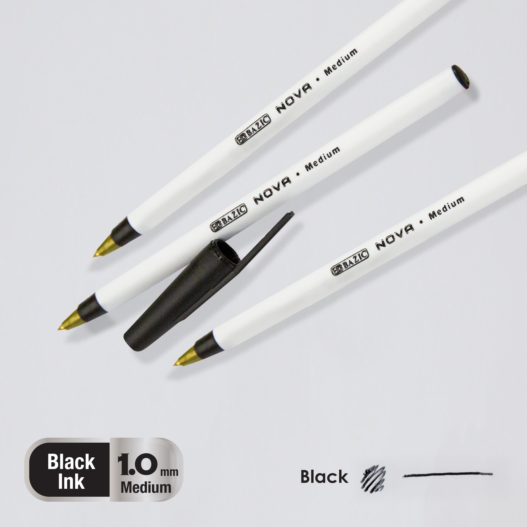 • NOVA BLACK COLOR STICK PEN. Each pack includes 12-Nova Black Stick Pens. The medium ball point spreads ink evenly as you write, offering dependable performance for everyday use.