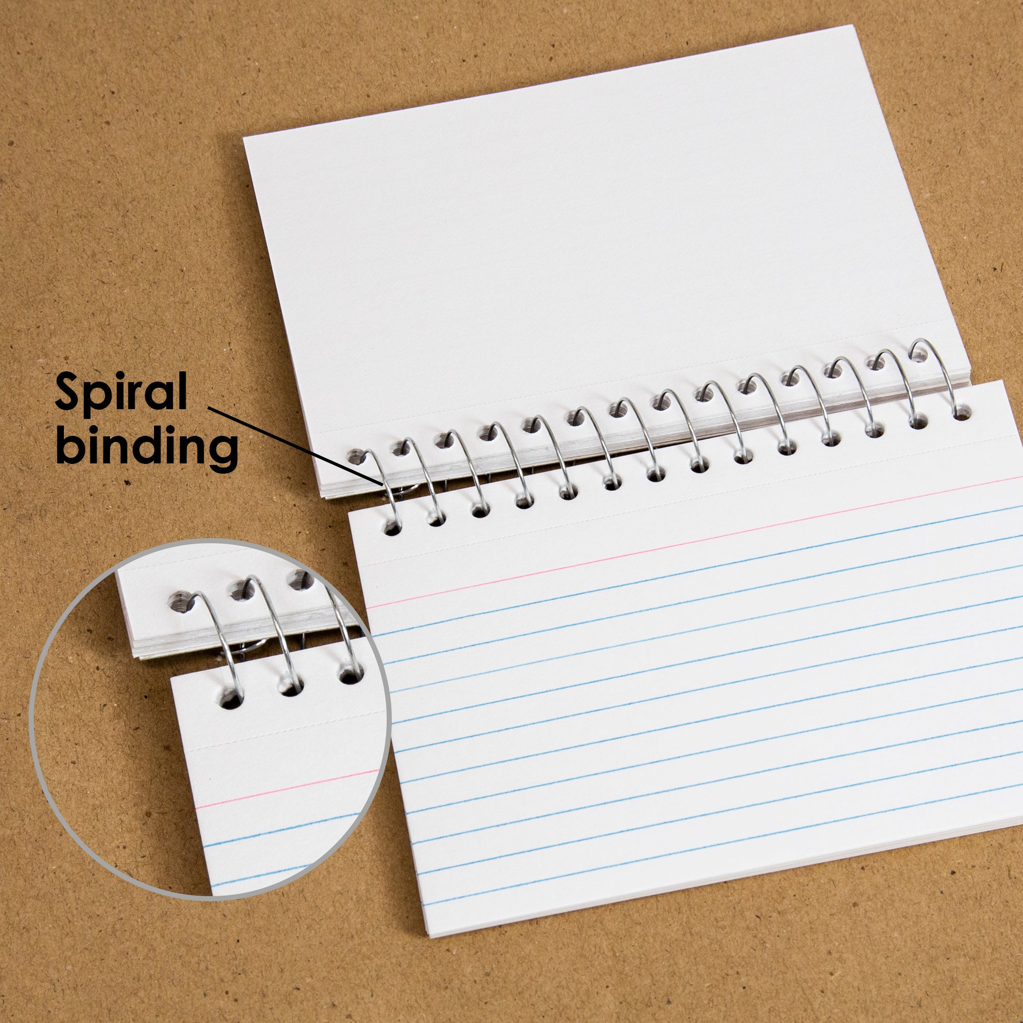 DESIGN. Spiral bound is designed by a shape of small book and spiral binding keeps cards in place. These index cards are ruled on one side while the blank back is great for flash cards for studying.