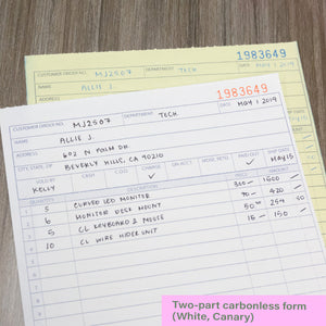 TWO PART CARBONLESS FORMS. White & Canary 2 parts paper. Customers get the perforated white top copy; Retain the yellow copy for your records.