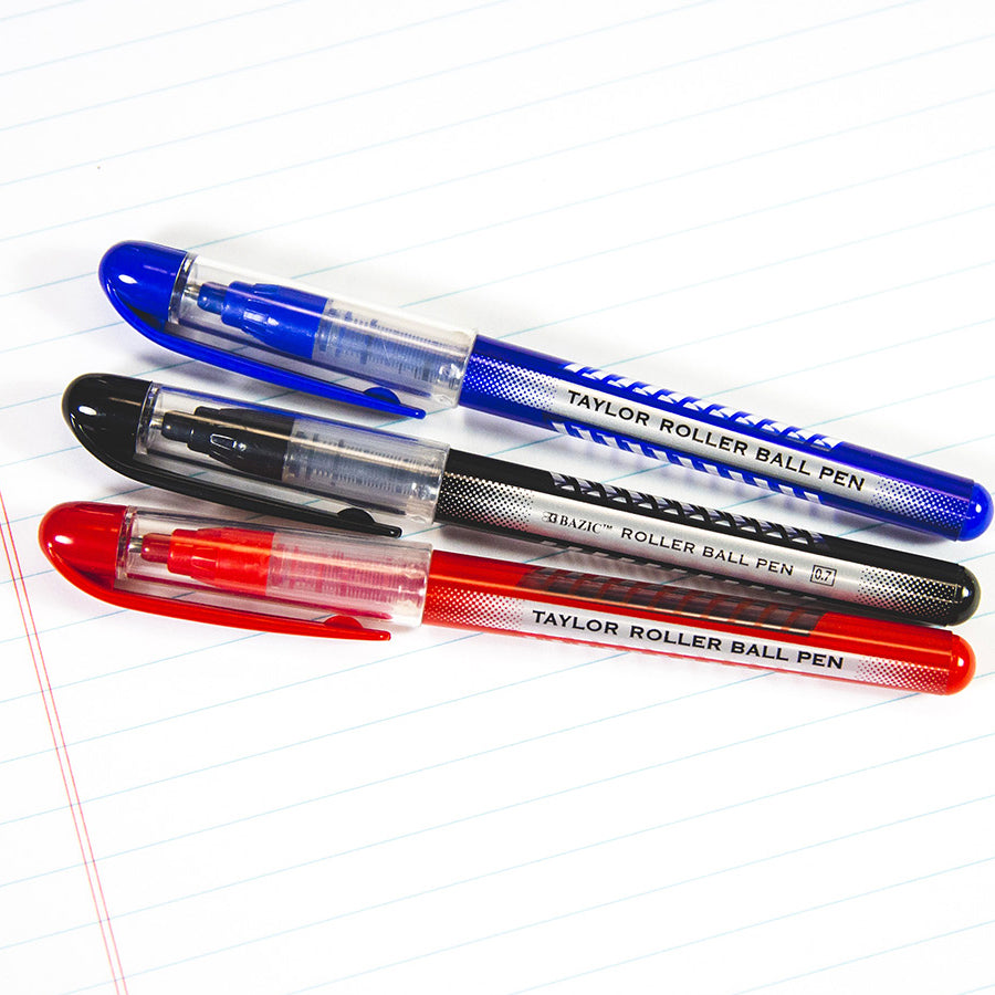 TAYLOR ASSORTED COLOR ROLLERBALL PEN. Each pack includes 3-Assorted Rollerball Pens; Red, Black and Blue. These fine point pens flow free and write more smoothly than traditional pens.